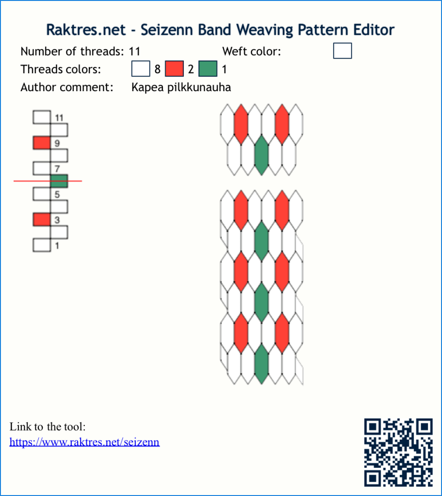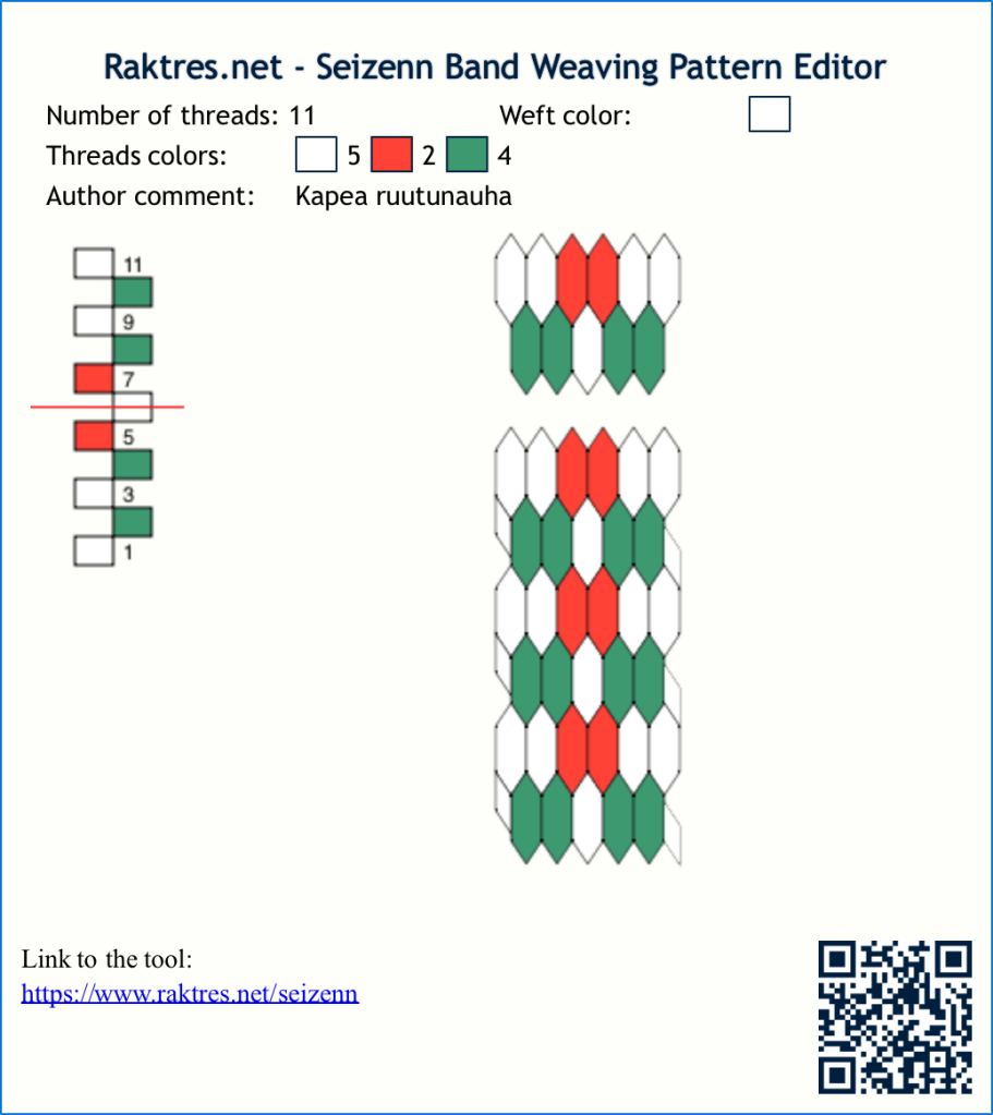Ota lanka, jota haluat käyttää. Kierrä sitä viivottimelle vieri viereen kahden sentin matkalle. Laske kierteet – tarvitset tämän määrän lankoja yhden sentin levyiseen nauhaan. Jos sinulla on 25 lankaa kahdella sentillä eli sentin nauhassa, mutta haluat 8 mm leveän nauhan, kerro luku 0,8:lla: 25 * 0,8 = 20. Pirralla kutominen on yleensä helpompaa parittomalla määrällä, joten sitten vain päätät, suunnitteletko/otatko 19 vai 21 langan mallin. Malleja on yleensä helpointa leventää tai kaventaa reunoista käsin.