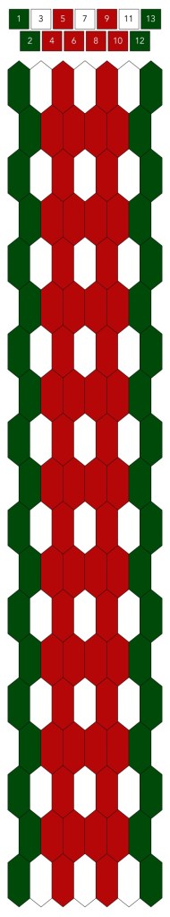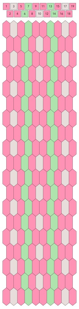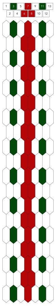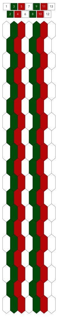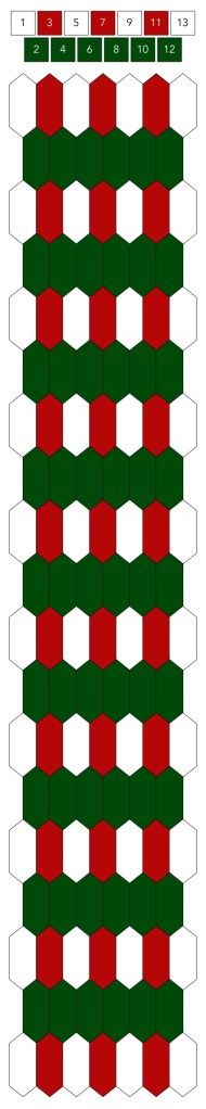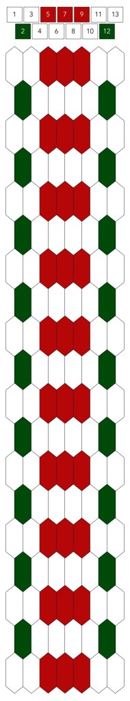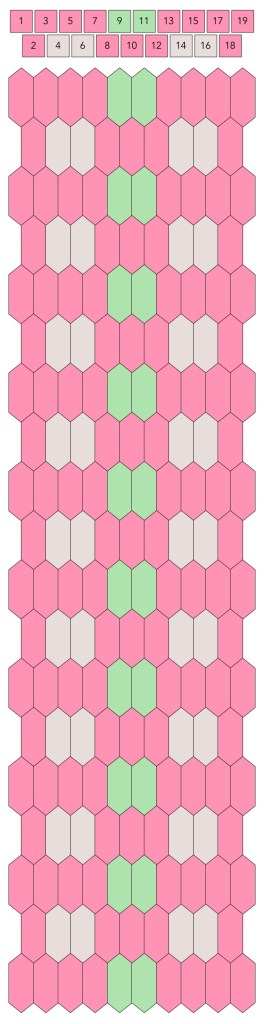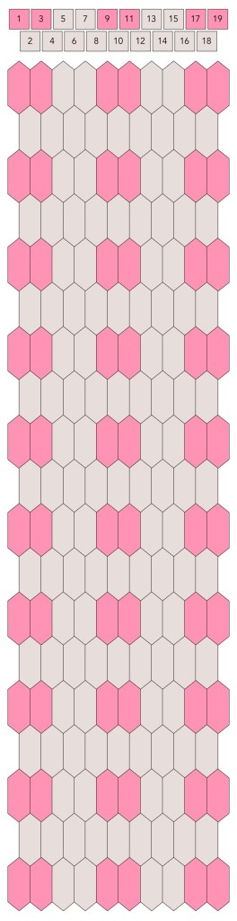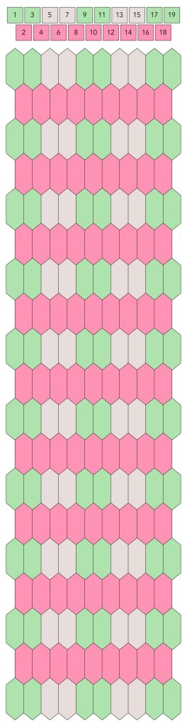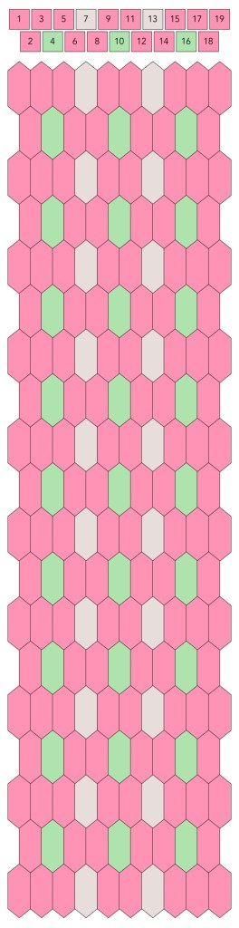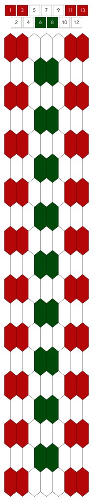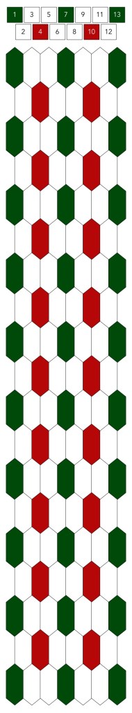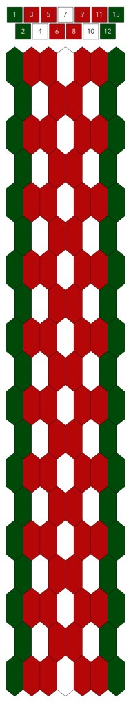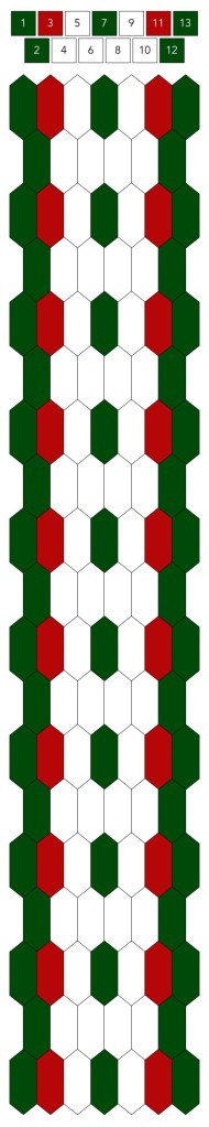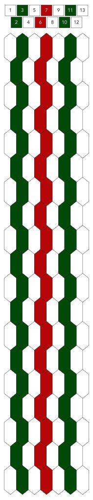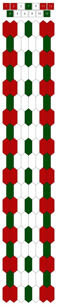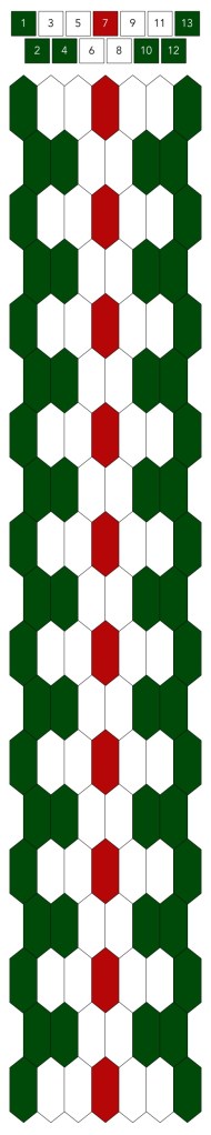 Mallin, johon lopulta päädyit, saat yllä olevasta valokuvasta, mutta tässä kaikki sitä edeltäneet versiot. Kuten näet lopullisesta mallista ja nauhasta, jouduin vähän muuttamaan värejä sen jälkeen, kun olin kurkistanut lankalaatikkooni uudestaan. Lanka on nimetöntä puuvillaista virkkauslankaa, kaikissa yhtä monta kierrosta kahdella sentillä (tai itse asiassa käytin tuumaa, mutta sama juttu).