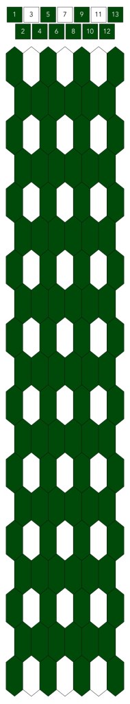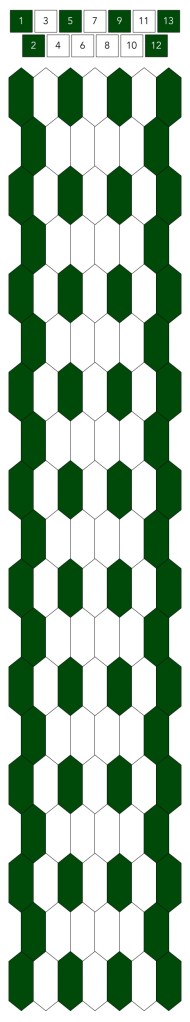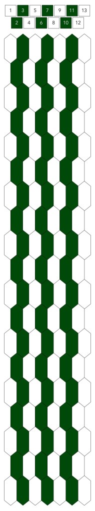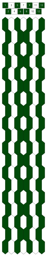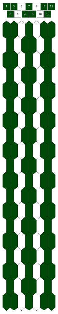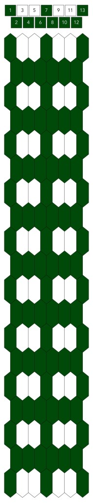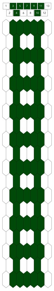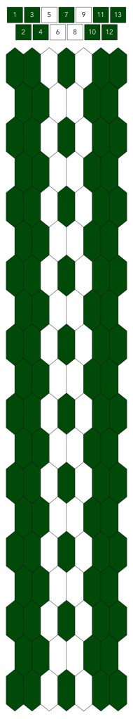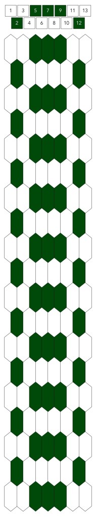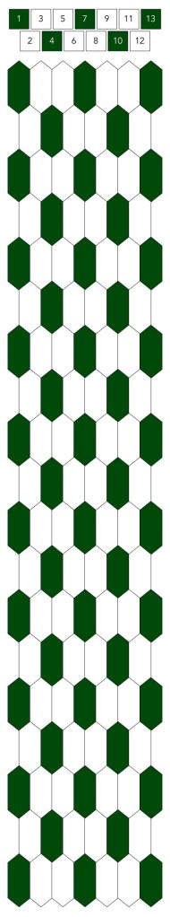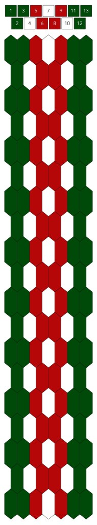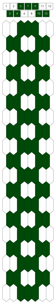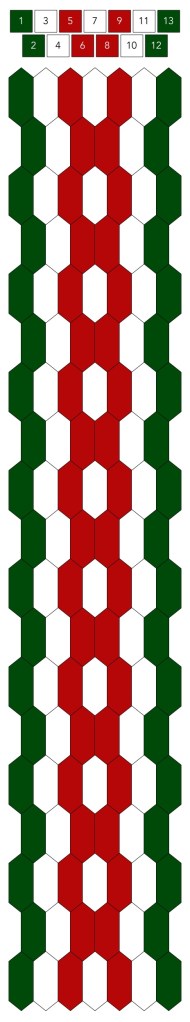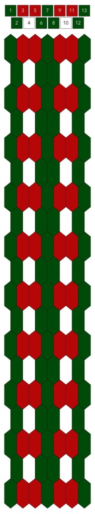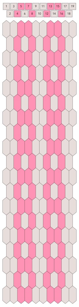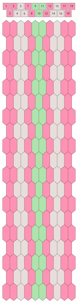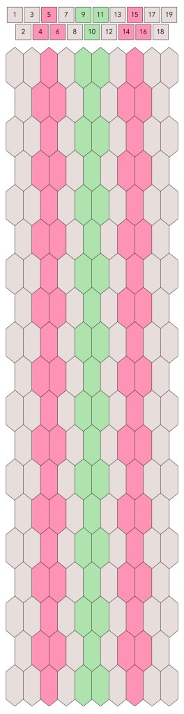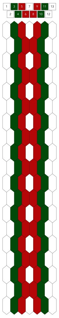 Mallin, johon lopulta päädyit, saat yllä olevasta valokuvasta, mutta tässä kaikki sitä edeltäneet versiot. Kuten näet lopullisesta mallista ja nauhasta, jouduin vähän muuttamaan värejä sen jälkeen, kun olin kurkistanut lankalaatikkooni uudestaan. Lanka on nimetöntä puuvillaista virkkauslankaa, kaikissa yhtä monta kierrosta kahdella sentillä (tai itse asiassa käytin tuumaa, mutta sama juttu).